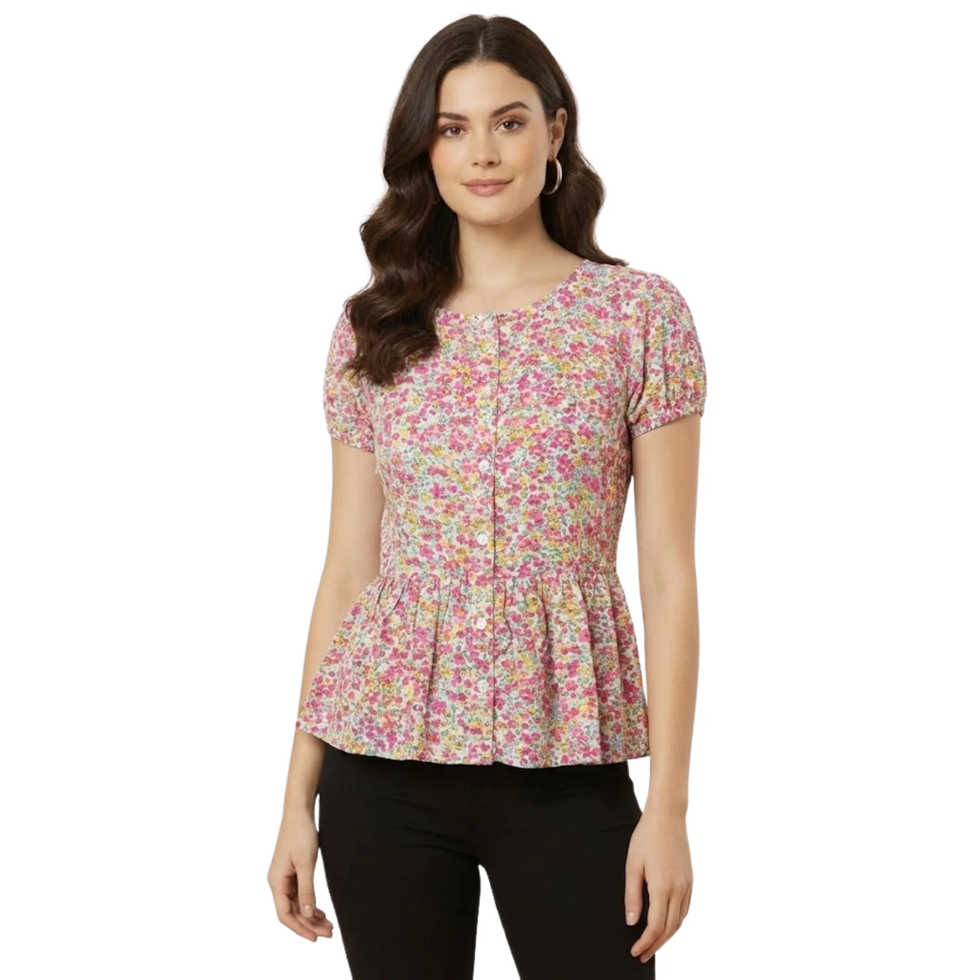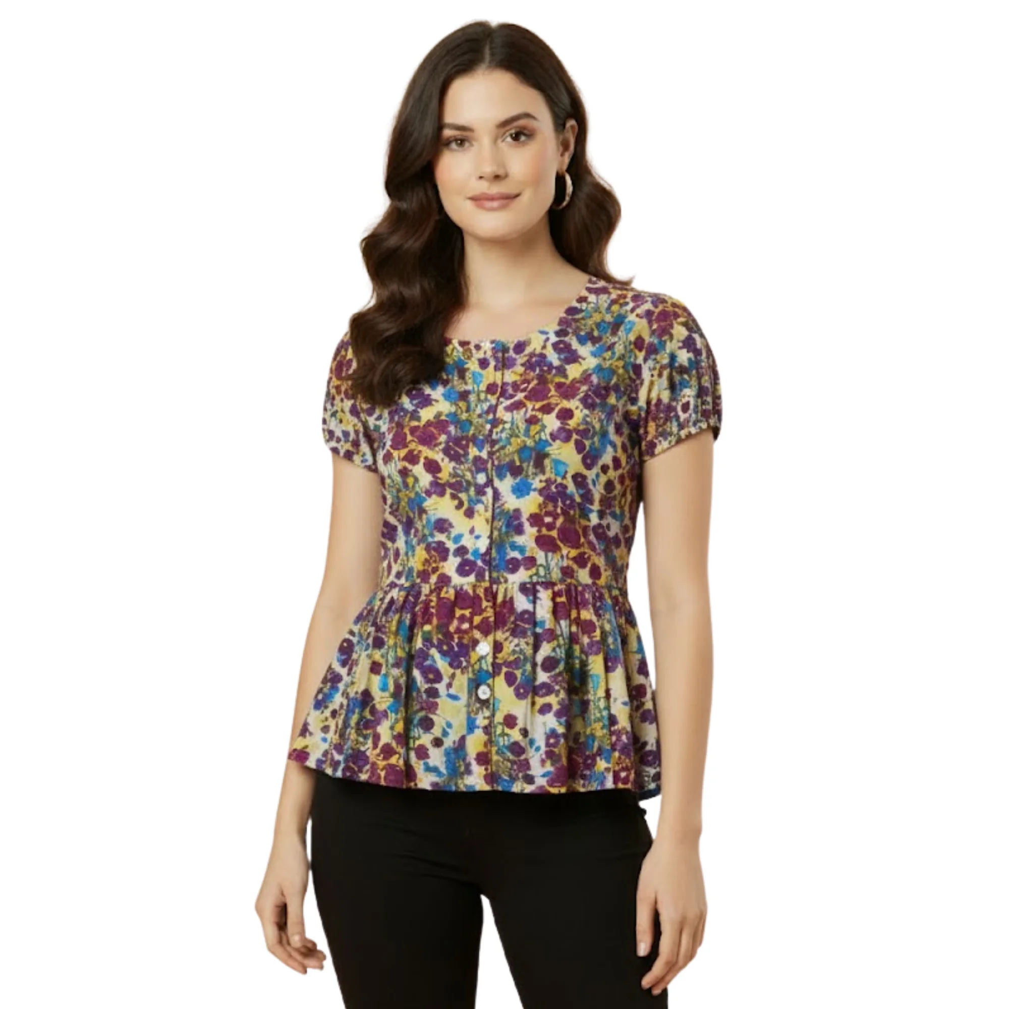 Crafted from premium polyester fabric, this top is lightweight, breathable, and comfortable for long hours of wear. The flattering peplum silhouette enhances your shape while providing a relaxed and stylish fit. The round neckline and short sleeves add a chic and feminine touch to the overall design.