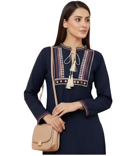 This elegant women’s woollen straight kurti combines traditional charm with contemporary style, perfect for winter wear. Crafted from soft, warm woollen fabric, it provides exceptional comfort during cold weather whilst maintaining breathability for all-day wear. The classic straight silhouette flatters all body types with its relaxed fit that allows easy movement. The standout feature is the beautifully embroidered multicolour detailing on the front yoke, showcasing intricate traditional patterns that add visual appeal. A stylish tassel tie-up at the neckline creates a graceful, trendy accent. Full-length sleeves offer additional warmth, making it ideal for winter and mild cold seasons. This versatile kurti pairs effortlessly with leggings, palazzos, or straight trousers, suitable for daily wear, office settings, casual outings, or festive gatherings. The solid navy base with detailed embroidery makes styling simple with both ethnic and fusion accessories. The skin-friendly fabric is easy to maintain and designed for regular use, making this woollen kurti a practical yet stylish addition to any winter wardrobe.